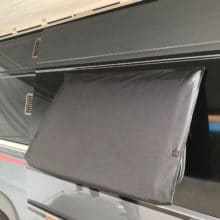 In addition, our customer also asked if we could solve the problem of the windows heating up and letting in too much sun on bright days. This we did, providing a custom made window cover, which fits snugly around the open window when tilted upwards.