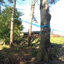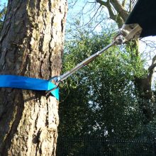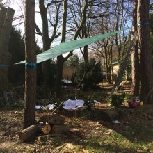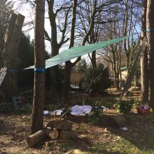 The beauty of the shade sail solution is we were able to use the surrounding to mount a cover opposed to adding new additional structures. The selected trees were prepared and measuring up could begin. This proved the trickiest part, the trees were all totally different dimensions and cambers as well as the uneven ground. Thankfully, technology could intervene at this stage. The assistance of a laser measure and a bit of clever maths meant we could accommodate the various angles accordingly.